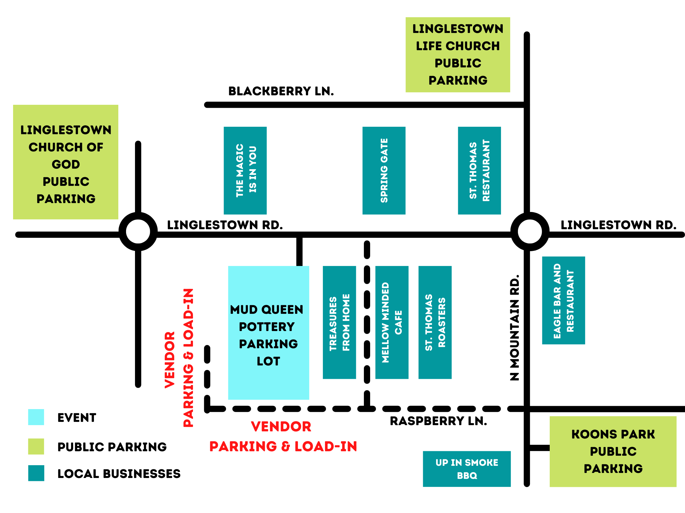 There are 3 free public parking locations available in Linglestown, but vendors are able to park in Mud Queen Pottery’s private parking lot behind the pottery barn.